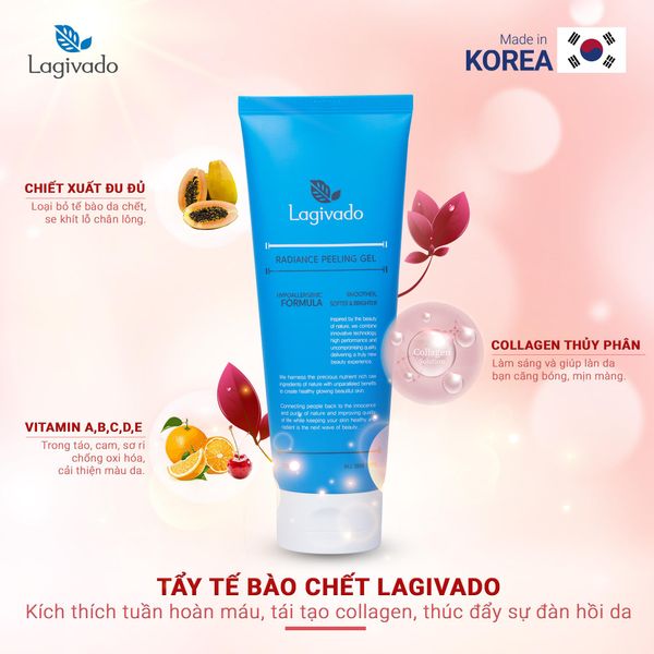 Hàng ngày, việc bạn tiếp xúc với môi trường và tác nhân bên ngoài như tia UV, khói bụi, cộng thêm việc biến đổi bên trong nội tiết tố và thiếu vitamin,… sẽ làm cho làn da của bạn trở nên khô héo, sần sùi và đặc biệt là quá trình lão hoá ngày càng diễn ra nhanh hơn. Tẩy tế bào da chết là việc lấy đi bụi bẩn, các tế bào da bị bong tróc từ đó giúp thông thoáng lỗ chân lông, làn da sạch sẽ, mịn màng hơn, kích thích sản sinh collagen tái tạo tế bào da mới. Chính vì lẽ đó, Lagivado - mỹ phẩm Hàn Quốc nhập khẩu chính hãng đã cho ra đời 1 dòng sản phẩm Tẩy tế bào chết để thực hiện sứ mệnh làm sạch tế bào chết cho làn da, giúp da ngày càng mịn màng và đẹp hơn.